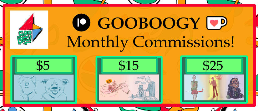 and a 20% discount code for my merch!How this works:1. I will post a form at the beginning of each month for you to fill out on my patreon or kofi page2. Fill out the form for the commission you want that monthOR3. Don't fill it out, and add it to your commission next month