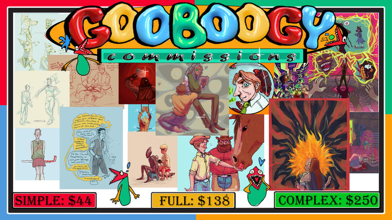 - If you do not have any references for the characters, props, backgrounds you are looking for and I can't just google it, then I will charge you +50% for conceptualization* (sidenote: my previous art can also count as a reference!)Will Do: Fandom, OC's, NSFW (you must be 18+), Ships, Gore, Robots, Monsters, there is not much I won't give a shot! I reserve the right to refuse a commission for any reason but you are more than welcome to ask regardless :)*Conceptualization: designing the visuals of a character from scratch, having a very detailed character, a detailed specific prop, a background that requires more detail/imaginings, or specific unrealistic situations (examples: an oc w/no reference, a robot with a lot of detailed parts, a detailed car, a specific fictional location I can't google, extreme fetishes, trippy background patterns, etc.)--